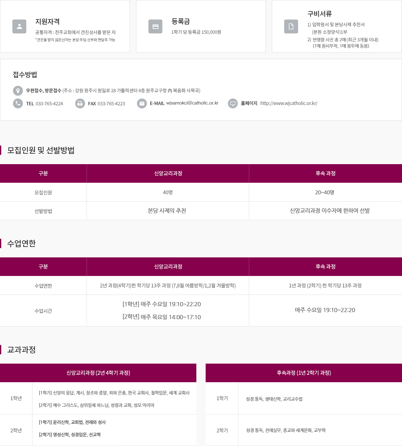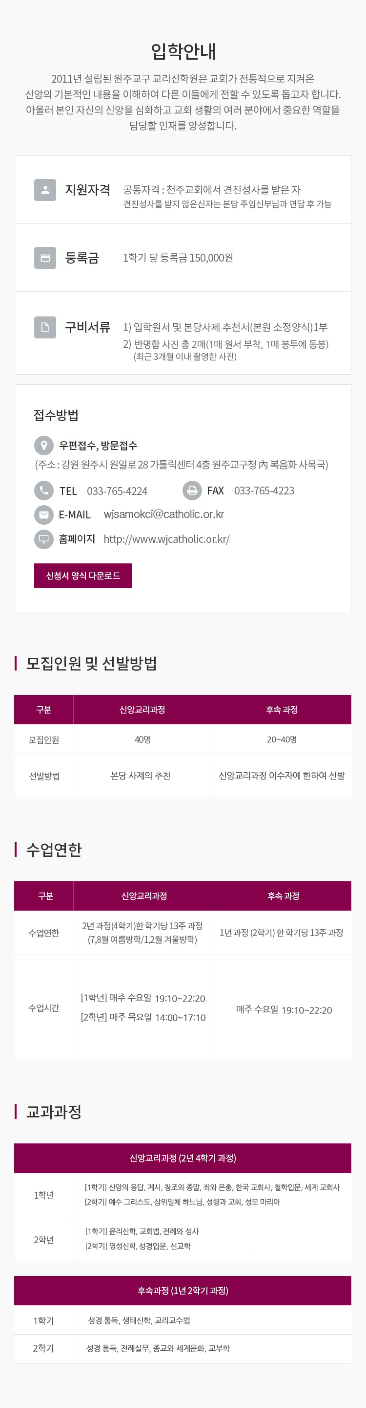 2011년 설립된 원주교구 교리신학원은 교회가 전통적으로 지켜온 신앙의 기본적인 내용을 이해하여 다른 이들에게 전할 수 있도록 돕고자 합니다.